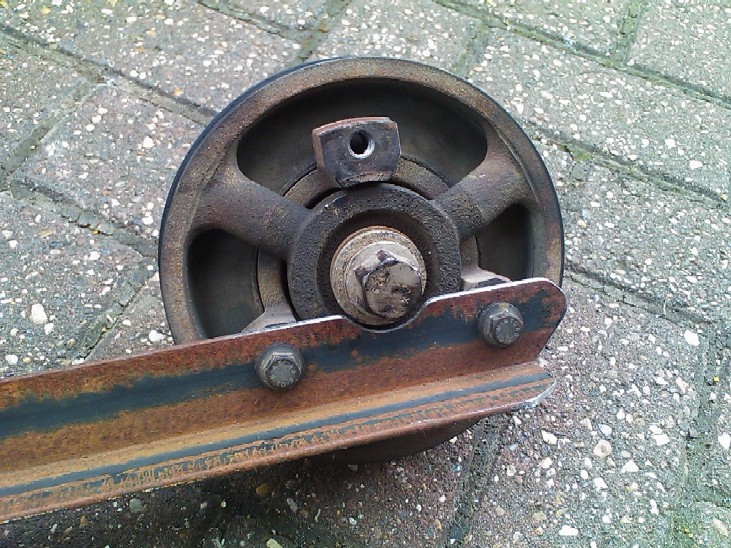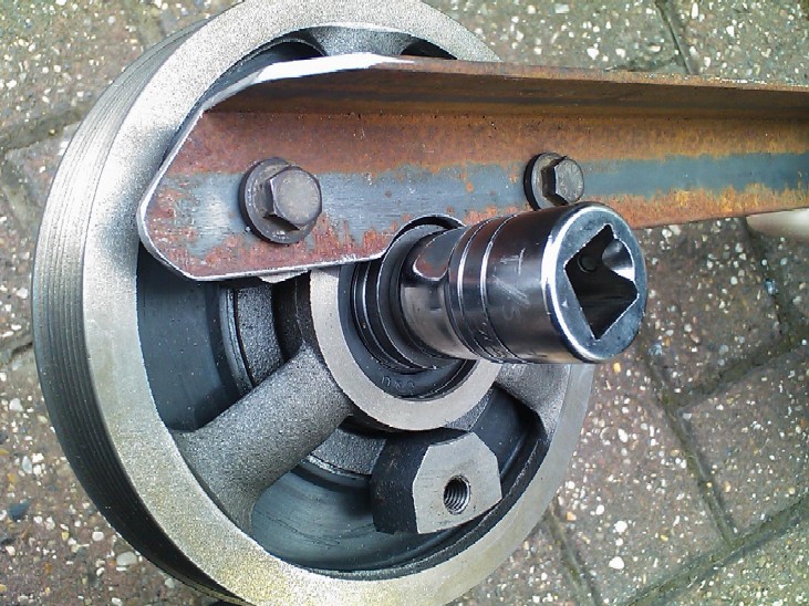 Right, so if your pulley is fubar'd like mine, you now have to remove the central bolt, this is VERY tight at 340lbs ft. There is no way you can stop the crank from rotating while trying to undo this bolt, so you will have to make a tool to do it. I chose to use a piece of 5mm thick angle iron at about 30 inches long, simply found in the works scrap bin!!........