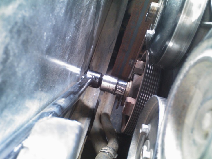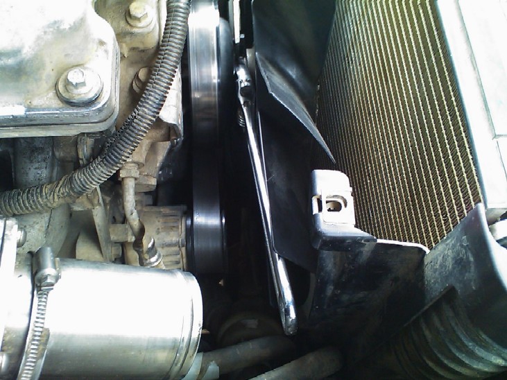 It's a tight squeeze to fit the bar and socket onto the bolt head, but it will go, a small tug forwards on the radiator will provide a little more room. *****NOTE the sheet of metal protecting the radiator*****