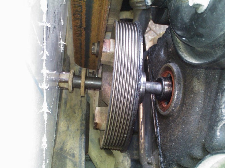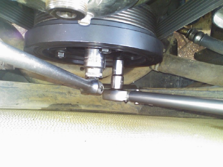 Clean up the crank oil seal carefully making sure you push no dirt into the engine........fit your tool to the new pulley and lower it into position with the new bolt already in it. There is no keyway etc on the crankshaft so the pulley can be fitted in any position. Start the bolt by hand, then tighten it up as much as possible using a standard 1/2" drive bar / socket. Now you will need a BIIIIG torque wrench to torque the bolt up, the figures are 340lbs ft or 460NM. To get a torque wrench that size, it is most likely going to be a 3/4" drive one, this was one of the reasons for choosing to have a 3/4" drive socket to crack the torque when removing. These big wrenches are a LOT of money, so if you have one great, if not you will need to borrow one if possible to do this job.