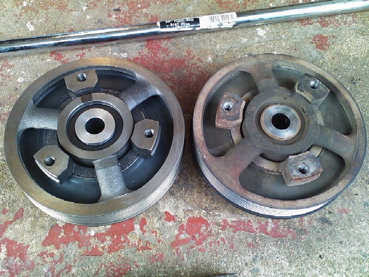 Here you can see the way its constructed and the rubber that mounts the 2 bits together. The rubber on the old one is all soft, and if you drop the pulley it "rattles"..............below another short video showing where its worn out....simply by resting it on the floor and a small amount of pressure it can be easily seen....