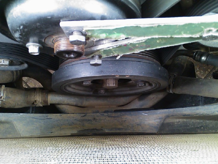 As the mileage and "use" of the vehicle increases, more and more stuff begins to wear out!!! (landys don't we just love em!) and the crankshaft pulley to my surprise is another one of those items. On most cars I'm used to a pulley bolted to the end of the crankshaft, made entirely of metal and expected to last the life of the vehicle.Well the TD5 crankshaft pulley is a little more "complex" than that. The pulley itself is made from several parts which are bonded together with a strong rubber, and to the front of that, a TV damper is also bolted to it. Rubber I hear you say ? well I was surprised as well........and it seems mine had come to the end of its useful life.
