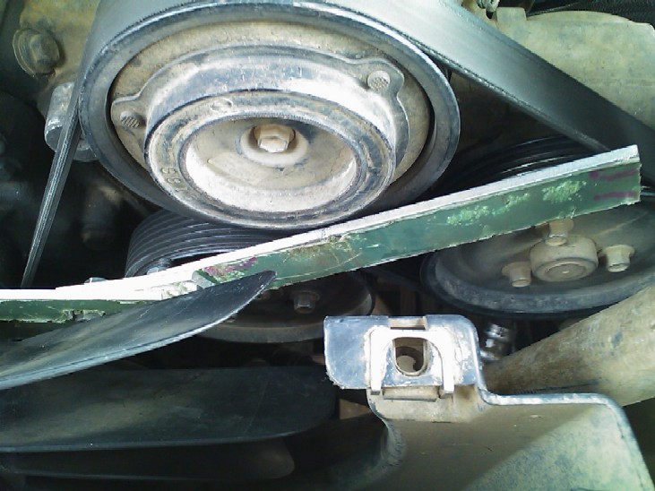 Once the fan is off, then remove the V-belt by using a15mm spanner to move the tensioner to the drivers side to release the belt of all the pulleys / pumps etc. A cranked ring spanner is useful here to move your knuckles away from the other engine components.