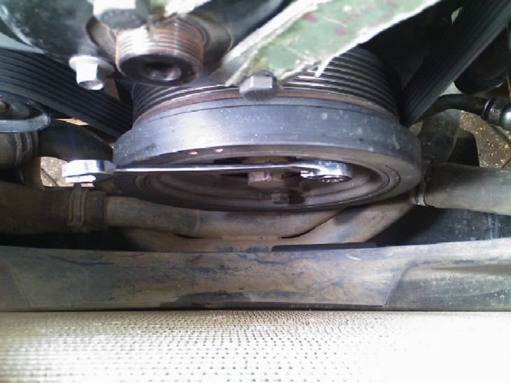 Now I used a 3/4" drive bar to crack the bolt off then immediately switched to a 1/2" drive bar to do the rest because if you undo the bolt to much, the bar will be hard up against your sheet of metal and you simply wont get it off again. You "could" use a 1/2" bar to crack it, but you would have to extend the bar with a tube to give you enough length to crack the bolt, up to you really but I'm a firm believer in struggling as least as possible, it will all depend on your selection of tools available. Once the bolt is undone, you can remove the damper, you wont get the bolt right out due to the lack of space, so you have to remove the damper with the bolt in it, its quite heavy so leave the sheet in place and use your tool to assist you in lifting it out. You may need a slight "lever" with a pry bay under the edge of the pulley to wiggle it free off the crank shaft.
