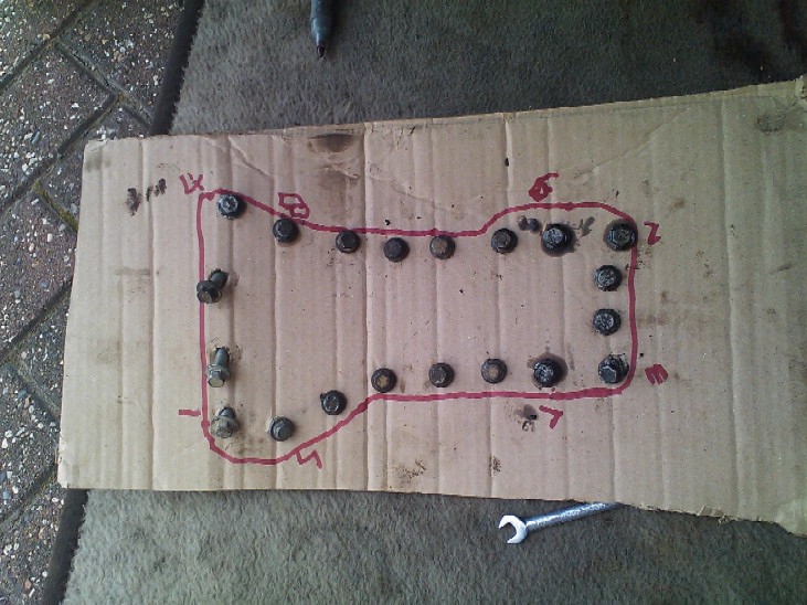 Now, most of the bolts are the same length, except the ones nearest the bell housing. There is 3 different lengths here, so you MUST note their original fitted positions. To save any possible error or confusion when it comes to the refit, you could do what I did and simply get a piece of cardboard and draw the shape of the sump on it, and each time you remove a bolt, poke it through the cardboard in the relative position it came from and number either a few for reference or all of them.