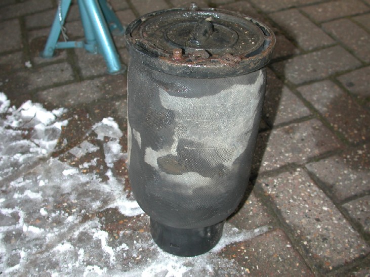 Here is a comparison of a new one to the old one. Now, depending on where you buy your new air springs from, will depend on how they connect back to the vehicle system. Land Rover charge TWICE as much for new air springs than any other spare parts retailers, Land Rover specialists and even Ebay is cheaper as well. My new springs have a "push" fit connector as opposed to the brass union "o" ring type found on the original springs. I'm not sure what type you would get even if you bought them from Land Rover, it maybe just a more modern way of connecting them up, who knows ?? My replacement springs were genuine Dunlop items, you can see the top connection difference in the picture below