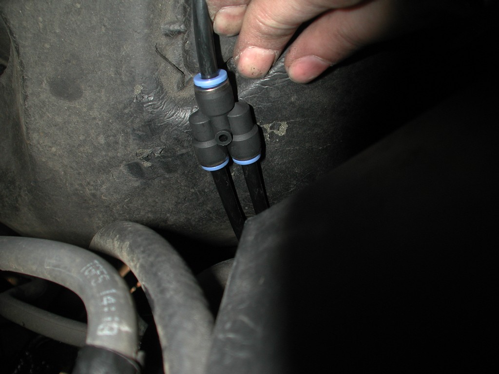 Here you can see I used a 90* and "T" connector to join them together, I then used 2 P clips to hold them in position and fixed it using the same screws for the fuel reset switch. Now onto the transfer case and Gearbox breathers. These are located at the back of the engine to the right hanside and are just "hooked" over the fuel pipes from the factory, its a bit poor really as they were chaffing on allsorts of other bits. To see them clearly just remove the engine plastic cover and you will see them tangled in there. They are actually clipped together, this made it easier to modify the routing off them. I had already cut of the loops form the end previous to doing the job, so I have no picture of that, but in the pictures below you will see enough for you to know what's going on. As I stated earlier, instead of having 4 tubes at a high level I decide to join them together so i only had 2 to route up the "A" pillars, (1 each side) Below you can see that they already run together, so it was easy enough to cut them level with each other and then fit a push fit "y" connector