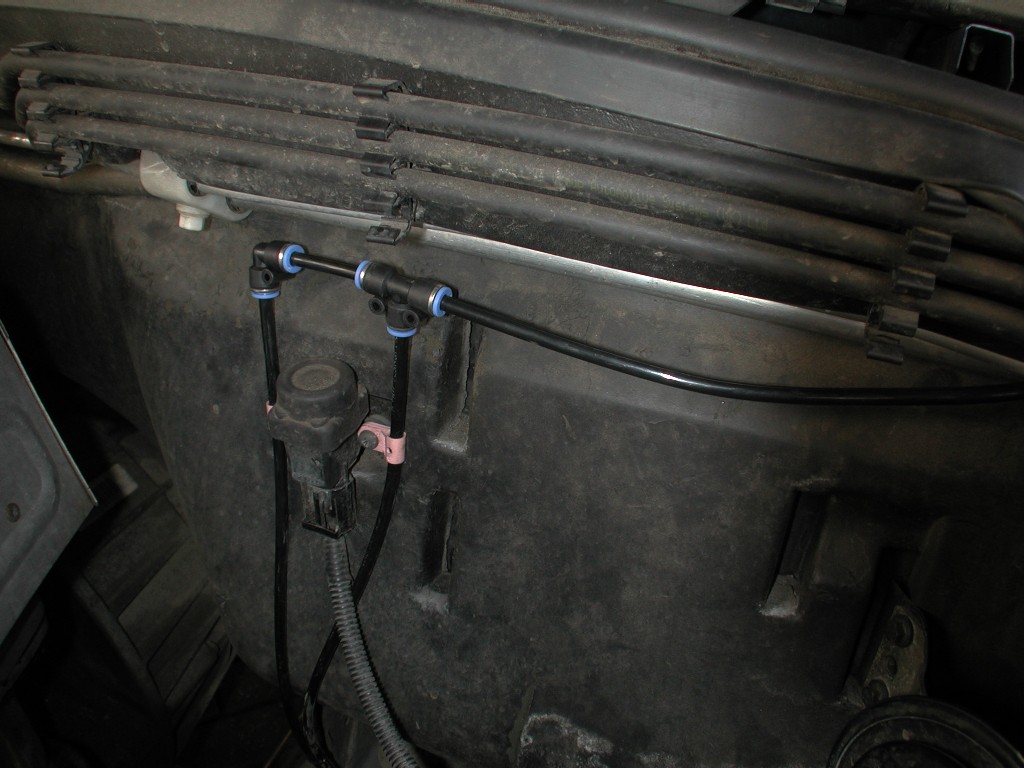 Another length of tube was then added long enough to reach up the A pillar to the top of the windscreen trim, on the drivers side its simply pushed behind the master cylinder and is held firmly there by the firewall insulation. It then goes through the heated windscreen wire grommet on each side and up the "A" pillar. Here is the passenger side again with the new tube added to go up the A pillar.....