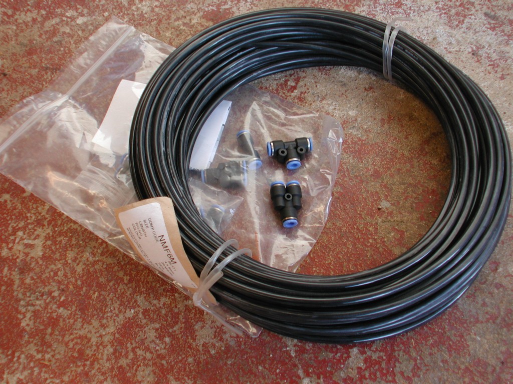 One of the most important modifications to your Land Rover if your ever going to take it for a swim is to extend your Axles, Gearbox and transfer case breathers to a "higher" location than the factory position. The Discovery 2's recommended wading depth is 20 inches, Obviously a Snorkel is the most important add-on if you wish to go deep wading, but its just as important to do the breathers to and better to be safe than sorry. 3 out of the 4 Disco 2 breathers are actually already high up in the engine bay, these are the front axle which is located at the top of the left bulkhead position, and the transfer case and gearbox are located together but not quite as high but on the right side of the engine just under the engine cover, left or right is referred to as you are driving the vehicle. The 4th breather for the rear axle is the odd one out, it does not come forward to the engine bay and it is only raised up under the rear left wheel arch and is the most likely one to be submerged if you waded deeper than 20 inches. Wading kits are available from many 4x4 sites and even on Ebay, but I chose to make my own to my preferences rather than a pre-made kit. The first obvious parts you will need is some Nylon Tubing. The standard breather tubing on the Land Rover is 6mm outside ,4mm inside diameter semi-flexible nylon tubing. There are many places to by this tubing in predetermined lengths, I chose to buy a roll of 30m in black for a very good price!! and then added some other bits to complete the kit. Although the tubing "is" semi flexible, it does not like tight turns in any direction, and because you will have 4 breather all at the same location, I looked for a way to join them together, so I bought some push fit pneumatic connections to help me complete this. I bought a few "T's" a couple of "Y's" , some 90* bends and some straight connectors to. This I thought would be more than enough for me to route the tubing exactly where and how a wanted it. Below is my roll of tube and you can see a few of the push-fit connectors as well
