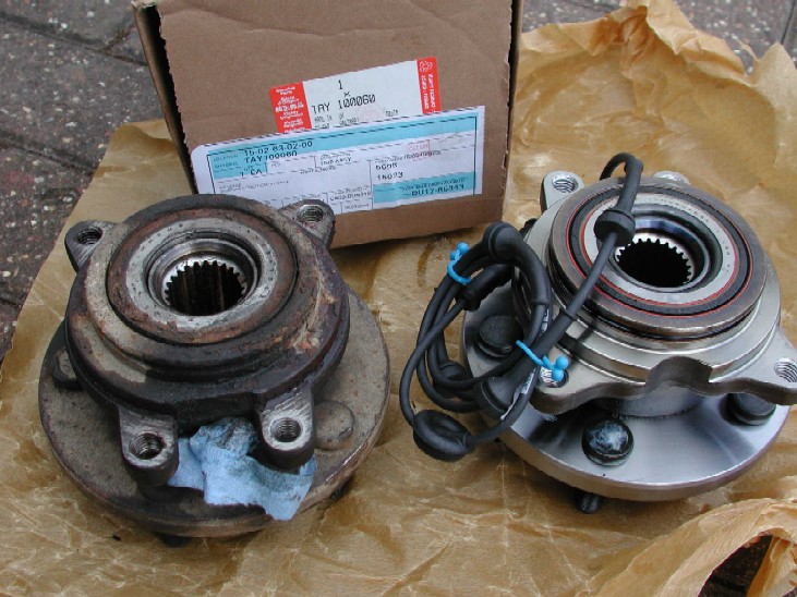 During this years MOT, it was picked up that the front offside wheel bearing had excessive play in it. Now when I was told this, if I'm honest I thought they were being a bit "picky" as its very common for the Discovery 2 to throw up the "3 amigos" ( ABS / TC / HDC) lights if there is a lot of play in a bearing as the ABS sensor picks up the fluctuations and goes mad. Well I had no lights at all, so all I could do was take it home and investigate. Well upon jacking up the truck and having a "wiggle", to my surprise they were not being picky, it def had a lot of play in both directions........dam, not a good thing as the front bearings on the Disovery2's are none serviceable and come as part of the Hub assy. These consequently are not cheap, the price's range from about £160 for replacement items, up to about £260 for the genuine Land Rover ones. Now if I'm honest, with such an important item and the "common" issues / faults that can occur with the ABS sensors etc, I bit the bullet and went for a Genuine item after a little haggling with my local dealer. Changing the front hub assy is not really a difficult job, but the issue is the final torque of the Hub nut on re-assembly, it is 360 Lbs ft or 490 NM, so do this you will need to have access to a pretty big torque wrench, fortunately I use them at work and it was easy enough to "borrow" one for the weekend. So first off, crack the wheel nuts loose then jack up and support the side your doing on an axle stand. Remove the road wheel and that will show you the Hub stake nut. Its called a stake nut as once its finally fitted, a punch or similar is used to "stake" a section of the nut into the slot in the drive shaft as a way of "locking" the nut on. A NEW nut must be used on reinstallation. So to remove the stake, simply use a small punch or old screwdriver and hammer / knock the stake out so you can undo the nut. Here lies the first issue, you need to "break" the torque on the nut. I m pretty sure its supposed to be 32mm, how ever I found that size just a little to "sloppy" for my liking with such a high torque, so I used an 1-1/4" AF 6 point socket as it just fitted better. Its about 0.025" smaller than 32mm and that seems to make all the difference. I would HIGHLY recommend you use a 6 point socket as to avoid the possibility of "rounding" the nut off. As well as a big torque wrench for refit, you really need a good breaker bar to undo it in the first place. I used a 3/4 drive 1.2m bar and even then it had some force applied before the nut come undone. Turn the wheel so it brings you away from the car when undoing the nut. I engaged my CDL and left the auto box in park and transfer box in LOW range to assist in holding the hub still and that was enough, you could also start the car and have a second person apply the brakes to also help hold it if need be. You just need to "break" the torque for now and undo 1 or 2 turns. Now you need to remove the brake calipers and brake disc as well. For "full" info on that check front disc / pad replacement article. For a quick guide, you need to first remove the pad carrying part of the caliper, undo the 2 bolts at the caliper sliders. Then before you lift the caliper away, unclip the ABS sensor loom from all the points up to the inner wheel arch. Then go into the engine bay and follow the loom to the connector on the inner wheel arch. It is just below the brake master cylinder on my TD5 (UK car). Feed the loom back out under the wheel arch and leave it there for now. Then lift the caliper away and rest it on the radius arm, take care not to kink or damage the brake pipe. You may need to remove the brake pads and store them safely out the way. Next you have to remove the inner part of the caliper, that's held on by the 2 12 point bolts that you can now see at the back of the hub. Now you can remove the brake disc by undoing the brake securing screw and then lifting of the disc. If your discs have been of recently then they should come off pretty easily, if not, then spray some penetrating oil around he centre part of the disc / hub and let it soak for a bit. Then if need use a block of wood and give the disc a little help with a hammer to remove it. Once the disc is off, you can then start on the Hub removal. The Hub is held on by 4 15mm bolts from the back, they should not be that tight. Applying a little penetrating / dis-assembly oil is always a good idea. Whilst your undoing those bolts, apply some oil to where the hub meets the steering knuckle as its been in there a long time!!. You will need to turn the wheel each way to get access to either the front or rear bolts, be careful of the brake caliper resting on the steering arm when doing this. As with the Hub nut, 6 pointed sockets are always advisable on items like brakes as they get treated to all the elements and are usually rather tight / corroded to come undone. NOTE the top rear bolt also holds on the bracket for the ABS sensor loom closest to the Hub. Now you cab remove the Hub Stake nut completely. Then using a hammer I gave the back of the hub a little "tinkering" all the way round to help free it from the steering knuckle. Its pretty easy to see if its started to come away. For the next part, the "official" way is to remove the Hub / drive shaft as one assy and then split the 2 when off the vehicle using a press if need be, this would also mean you would have to replace the drive shaft oil seal as well.. Well this would be a pain in the bum to me, so I tried it a different way I loosely re-fitted 2 bolts back into the Hub and then used a standard 3 legged puller on the Hub itself and after a few turns it simply began to come free from the driveshaft