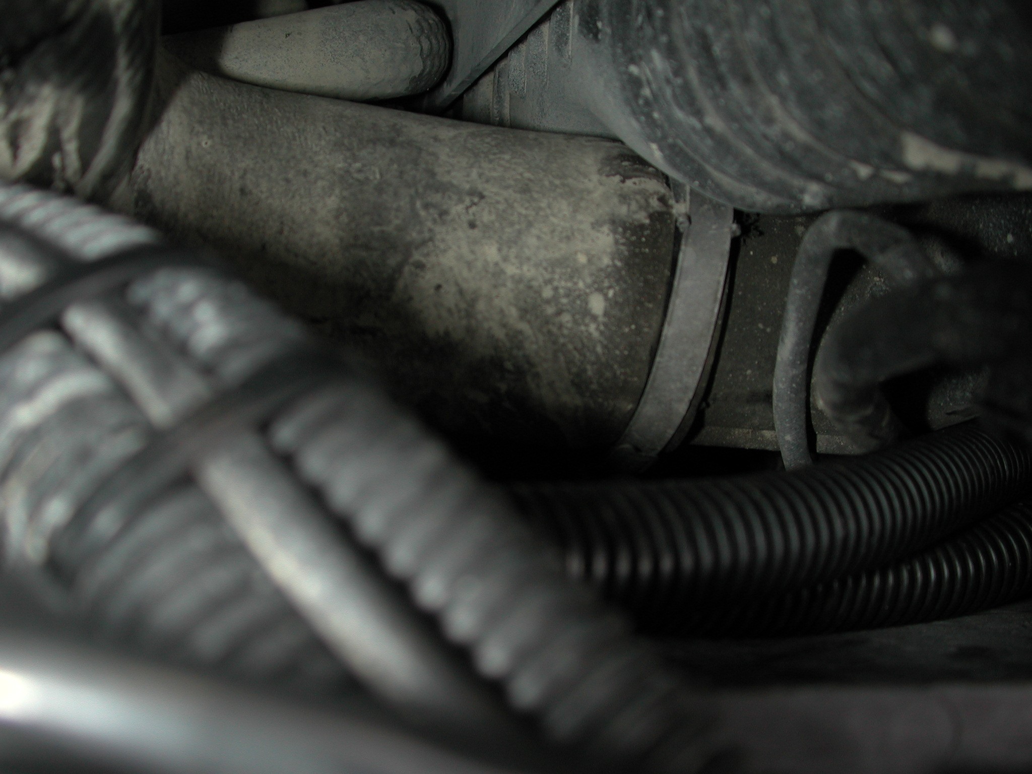 In the picture above is what you should have now, Grille, lower headlight trims and indicators out. You may notice that my fan shroud etc is still fitted, that is just because I took the photo's in a different order, Also the top headlight "clip in" covers and battery cover are also removed. Now you have gained access, its time to start getting at the intercooler. It has 2 hoses connected to it, the top one goes to the EGR valve on the driver side, the other on the passenger side comes from the turbo. Each hose has 2 large jubilee clips pictured below