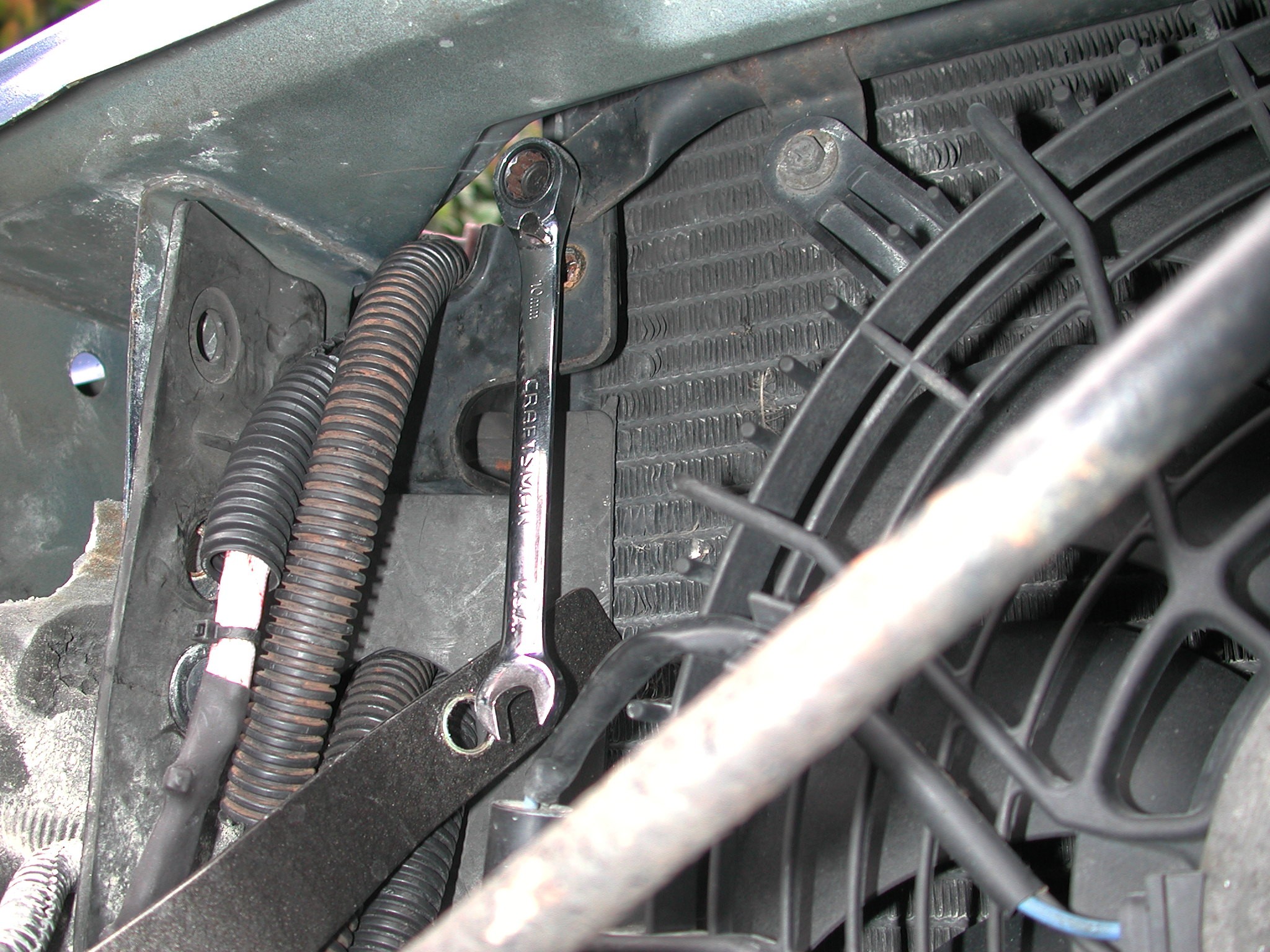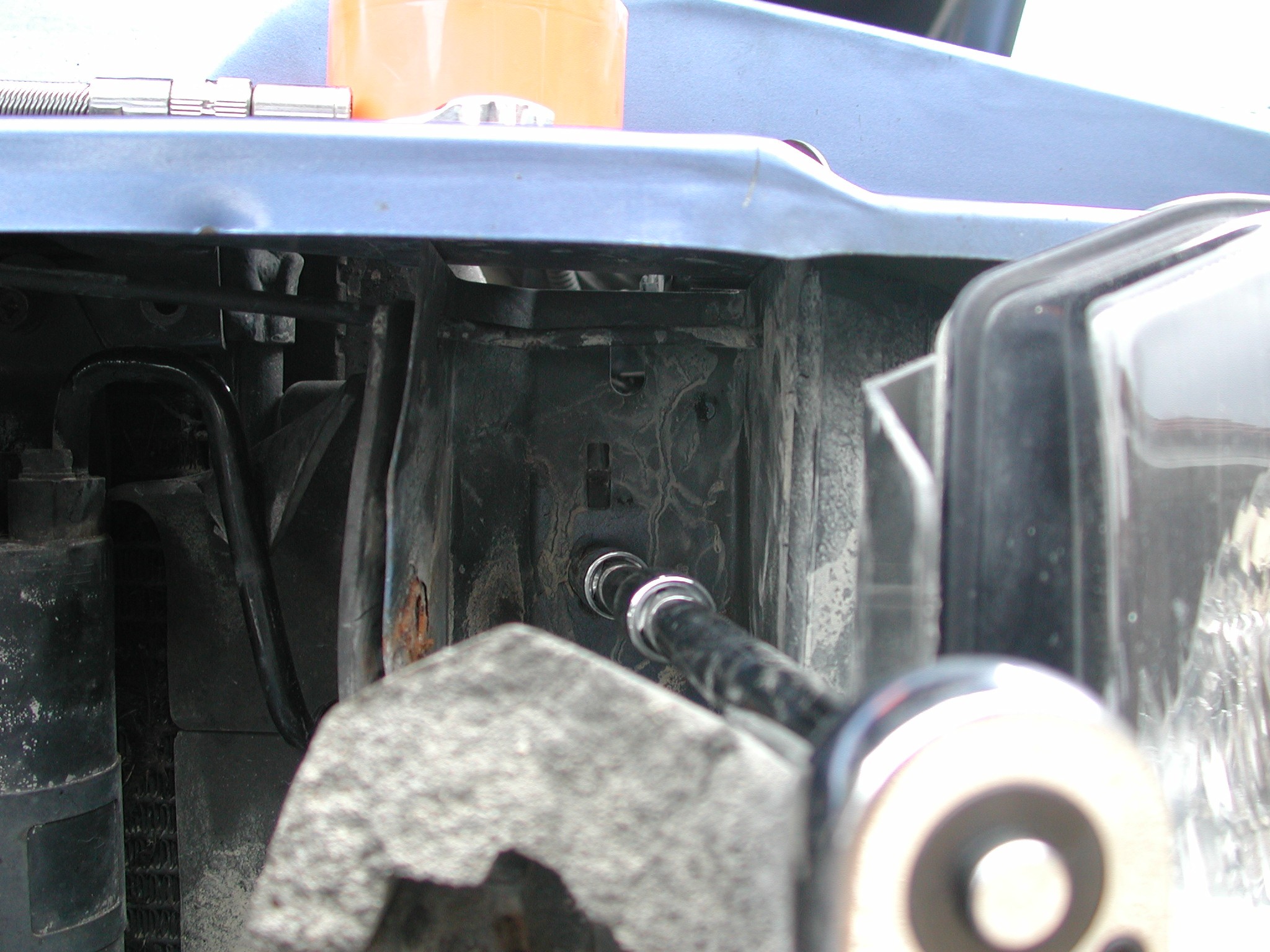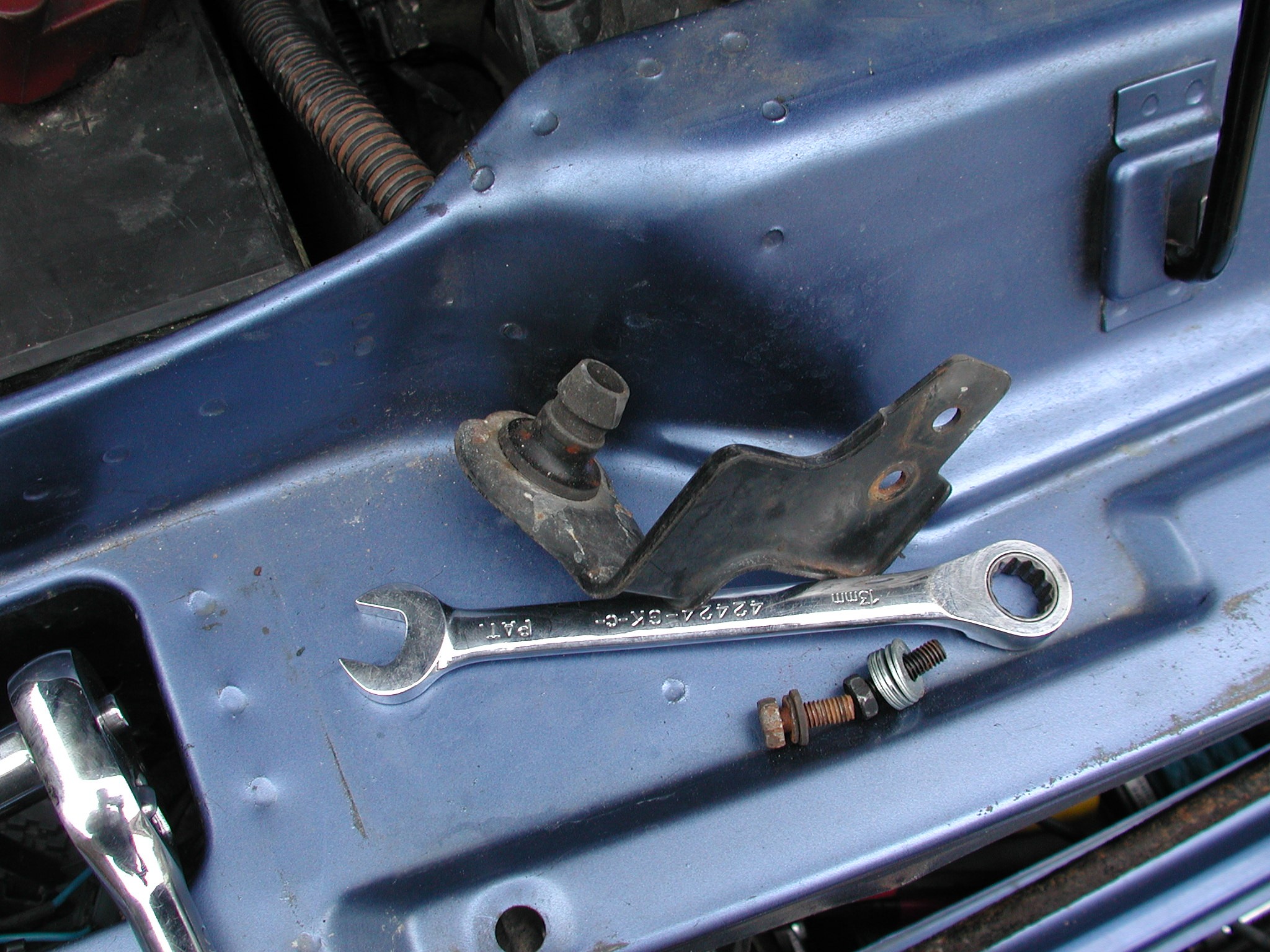 In there you will see another 10mm bolt that holds the bracket on the engine side of the front bulkhead. Its the same for both sides of the car, and can easily be access by a ratchet and an 8 or 10 inch extension.