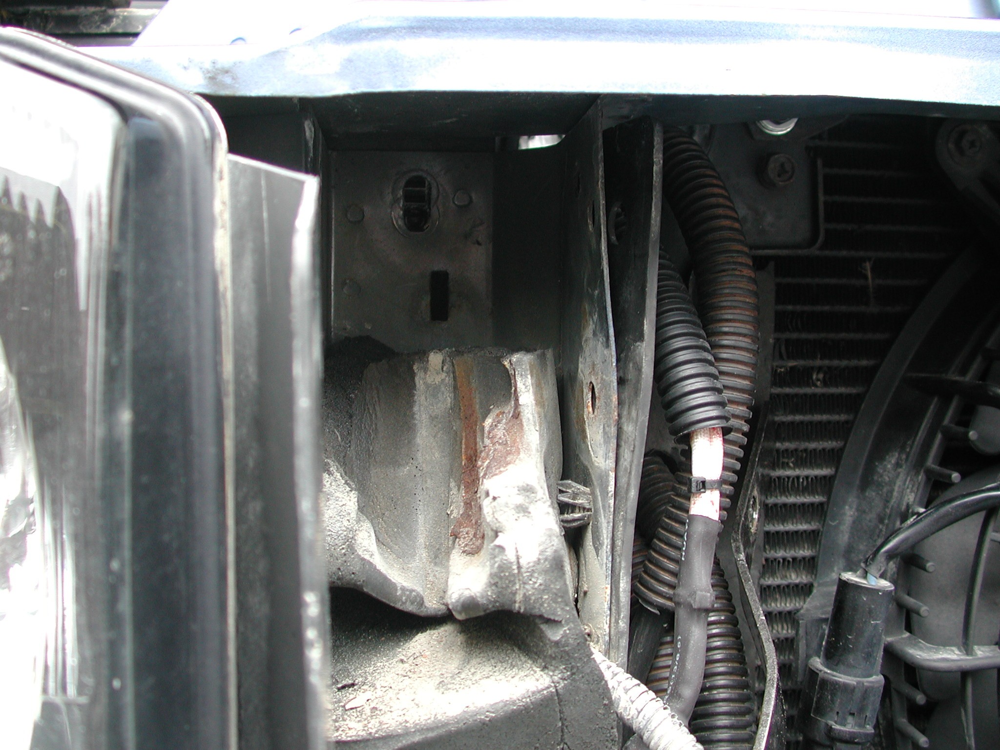 Now you have to remove the 2 horns (1 each side) to get access to the mounting brackets. The Intercooler , radiator and air con heat exchanger are all attached to the same brackets. To remove the horns, it is 1 x 13mm nut on each horn, then you have to "lever" the horn out of its location.