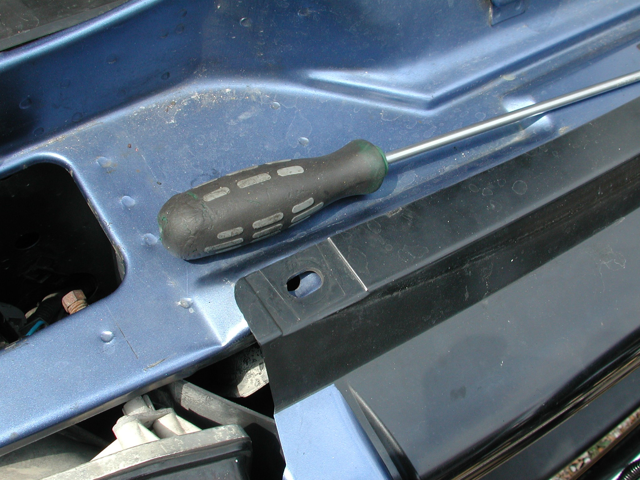 This then reveals the 2 lower fixing screws for the front grille. Remove those from the grille end of the angle bracket. Once those 2 screws (1 each side) are removed, then you can simply tip the top of the grille away from the front of the car, and carefully lift its 2 bottom feet out and away it comes. My car is fitted with a factory "A" bar, so its a little more fiddly, but there is still enough room to maneuver it away.