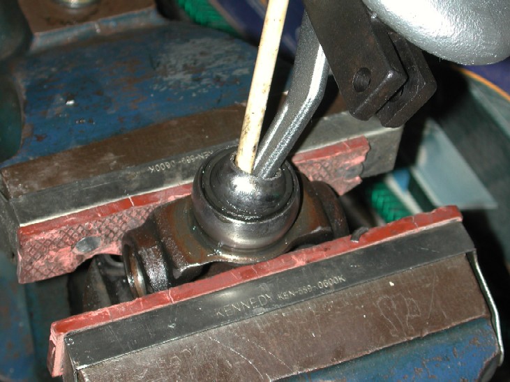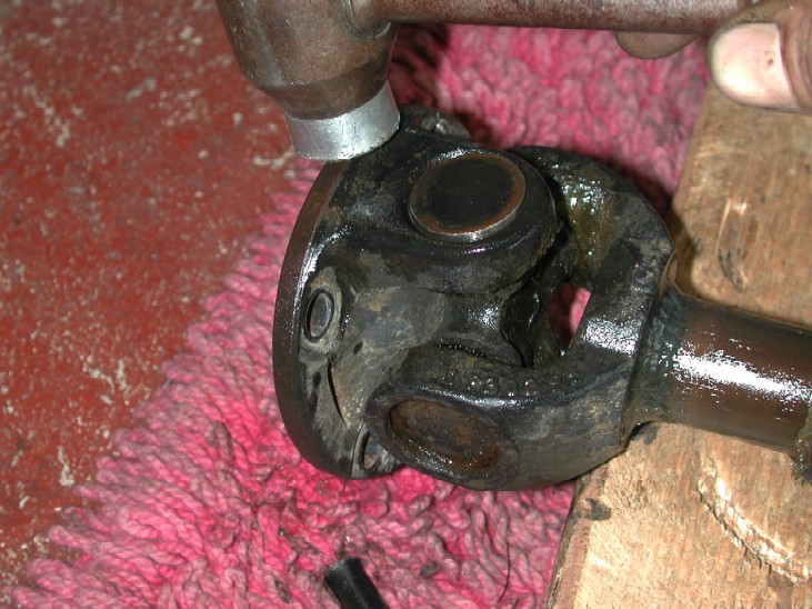 Now its time to get the UJ out of the 2 yokes, there is several ways you could do it, the workshop manual tells you to tap the yokes to get the bearing caps moving. This worked a treat on the UJ's that had grease nipples from the factory