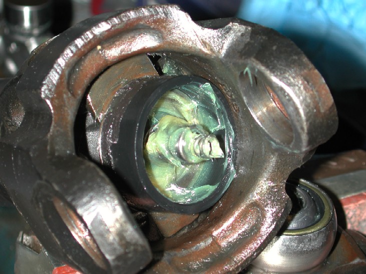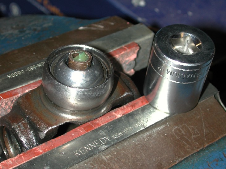 Now to re-fit the new bearing I used a 1" socket. It actually fits perfectly over the bearing and inside the bearing housing of the yoke. After a little help with a hammer, the new bearing was driven into place.