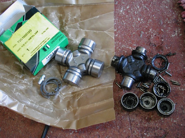 Check the joint moves in all directions smoothly, it should feel nice and smooth and probably a little tighter then the original ones. The procedure above is identical for the rear shaft UJ's and the Double cardon joint. The double cardon or "hookes" joint is a little more fiddly as you have to UJ's to do. Again remove the circlips first, then I remove the end Yoke from the shaft then the rest of the joint. Tapping the yokes with a hammer, and even a direct hit on the bearing caps with a large punch and mallet really would not move the caps at all, so I resorted to the socket and vice method I used earlier. This and some grunts and groans eventually pushed the UJ caps out. The double UJ also contains a centering bearing that sits on the end of the shaft and is there to keep a constant distance / angle between the 2 UJ's as they move at different angles. I found it very hard to locate a new bearing for this, and even talking direct GKN proved unhelpful as they will only sell you a complete shaft!!! ***NOTE!!!, when you pull the joint apart, there is a spring and needle rollers in the centering bearing, be very careful not to loose them !!!***
