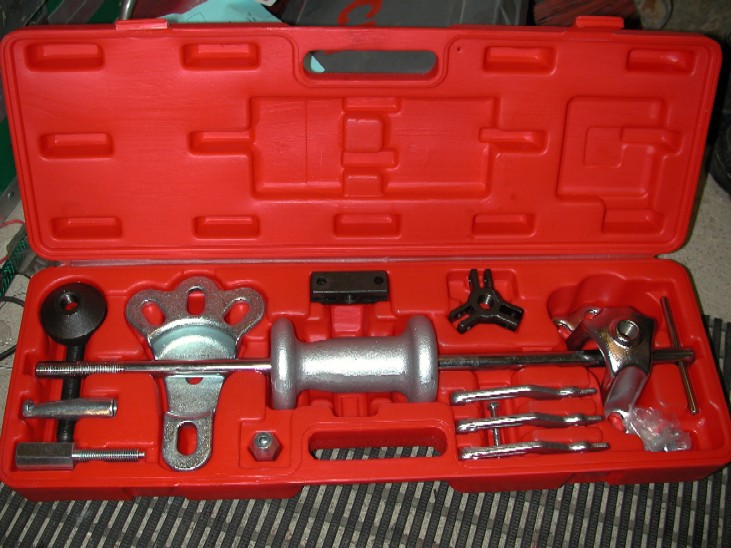 Above is a slide hammer kit I bought to do this job (any excuse hey!!), it comes with lots of attachments and will be useful for lots of jobs in the future as well, from bearings to hubs to flanges etc etc. It also includes some internal pulling lugs that will actually fit inside the centering bearing and provide a way of removing it. So what I did was rig up one pulling leg onto the hammer, hold the prop yoke in a vice, then insert the slide hammer into the bearing and also a screwdriver to "pack" it out tight.