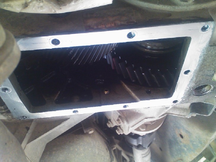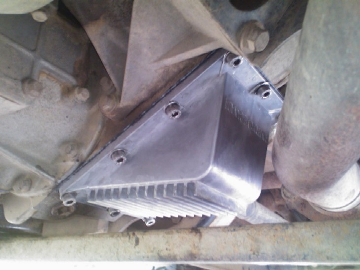 This is a simple bolt on solution for the LT230 box fitted to Discovery 2's, it also fits previous models that use the LT230 transfer case. It simply replaces the existing bottom cover on the transfer case and as well as having the "cooling fins" cast into it, it actually increases the capacity of the oil by about another 3/4 of a litre, which again can only be a good thing as more oil will "absorb" more heat and if its being cooled as well its serviceable life will be extended. You may also notice from the above picture that it has a "blank" where you can if you wish drill and tap the sump to add your own additional temperature switch. To install the sump I removed the FWD cross member from underneath the transfer box to make it easier to fit the sump, I think you could probably do it without removing it, but its far easier out the way.