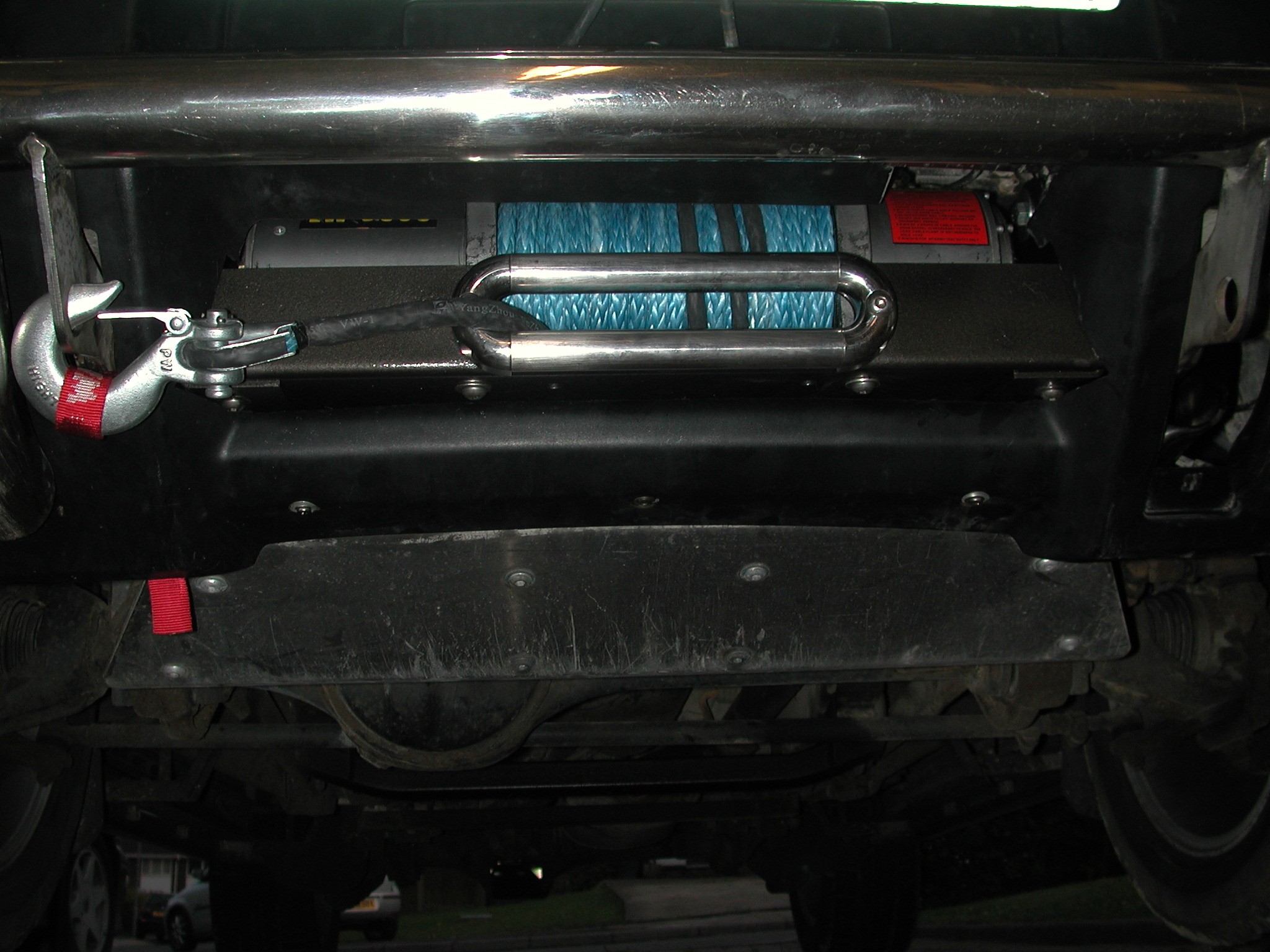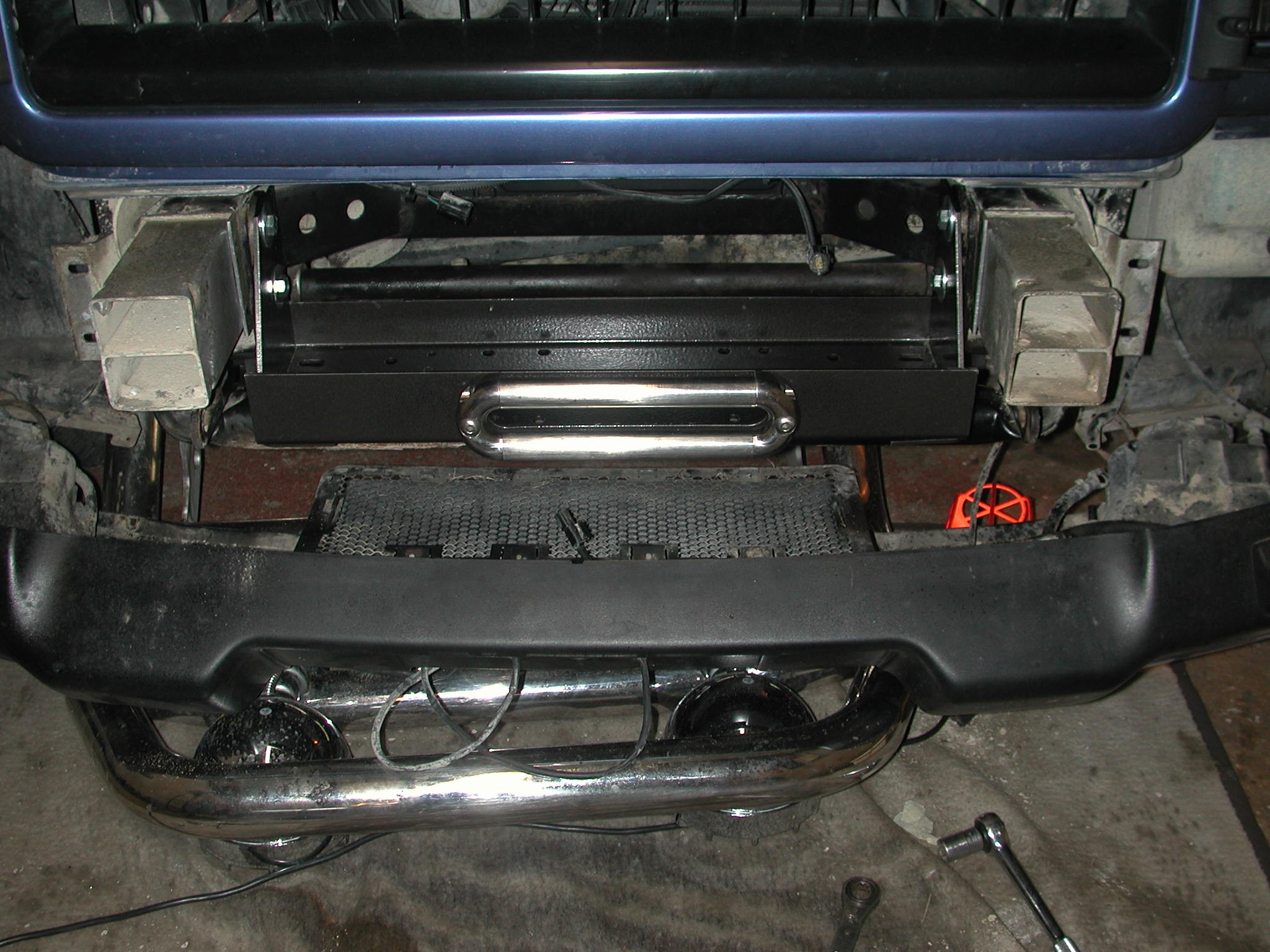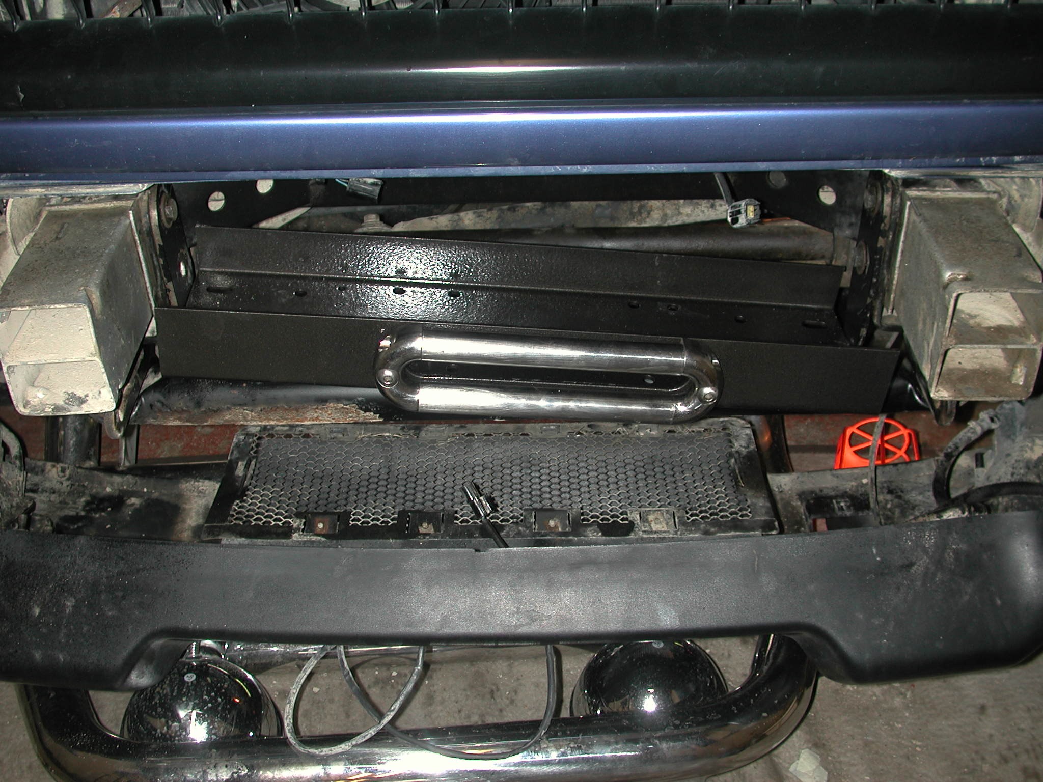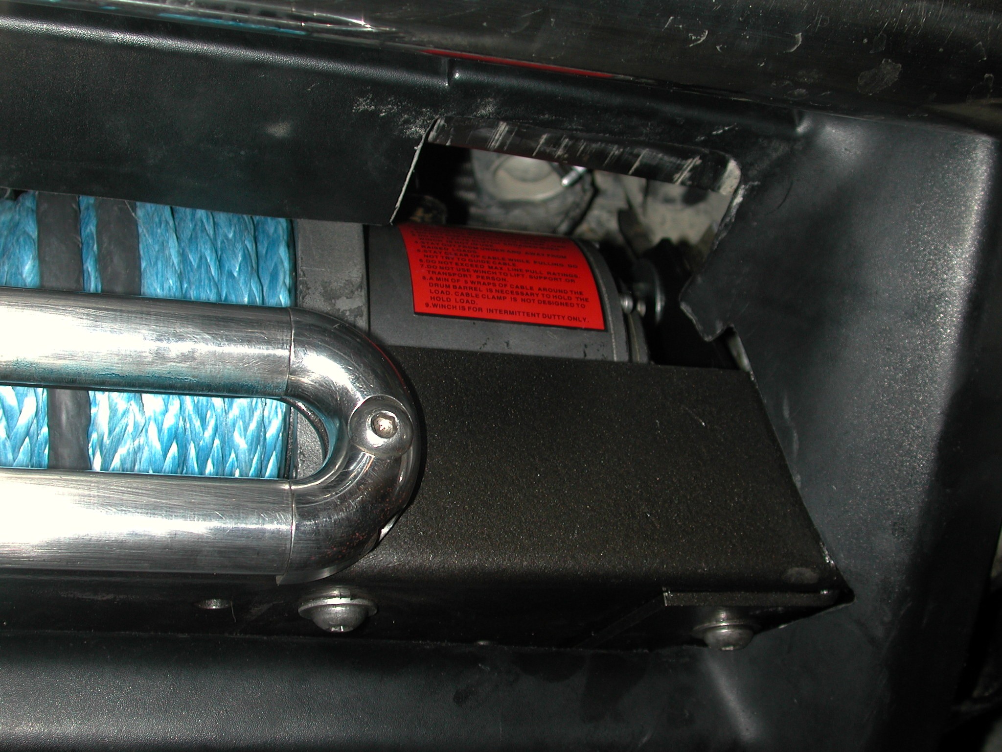 On the right of this picture and below you can also see I cut an extra portion out of the bumper, this is needed because of the "discreet" plate, you still need access to the manual clutch lever on the winch gearbox, this cutout allows you to get your hand in to use the clutch for free spooling the rope of the drum etc.