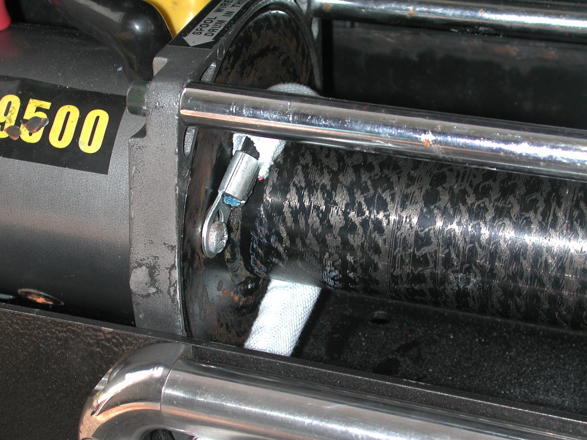 The rope is held at the motor end with a ring terminal and screw, then its just a case of powering the winch in an feeding the new rope onto the drum as neatly as possible.