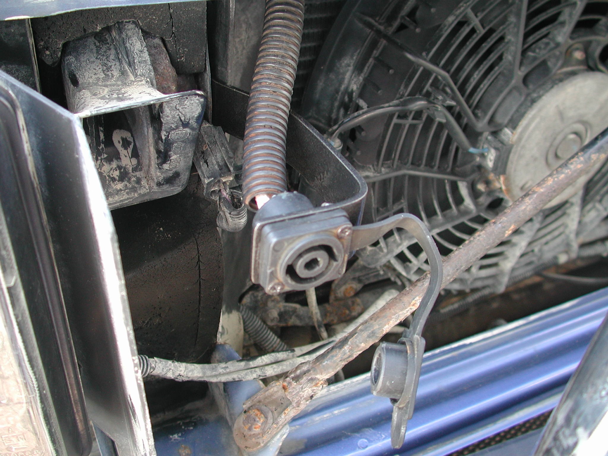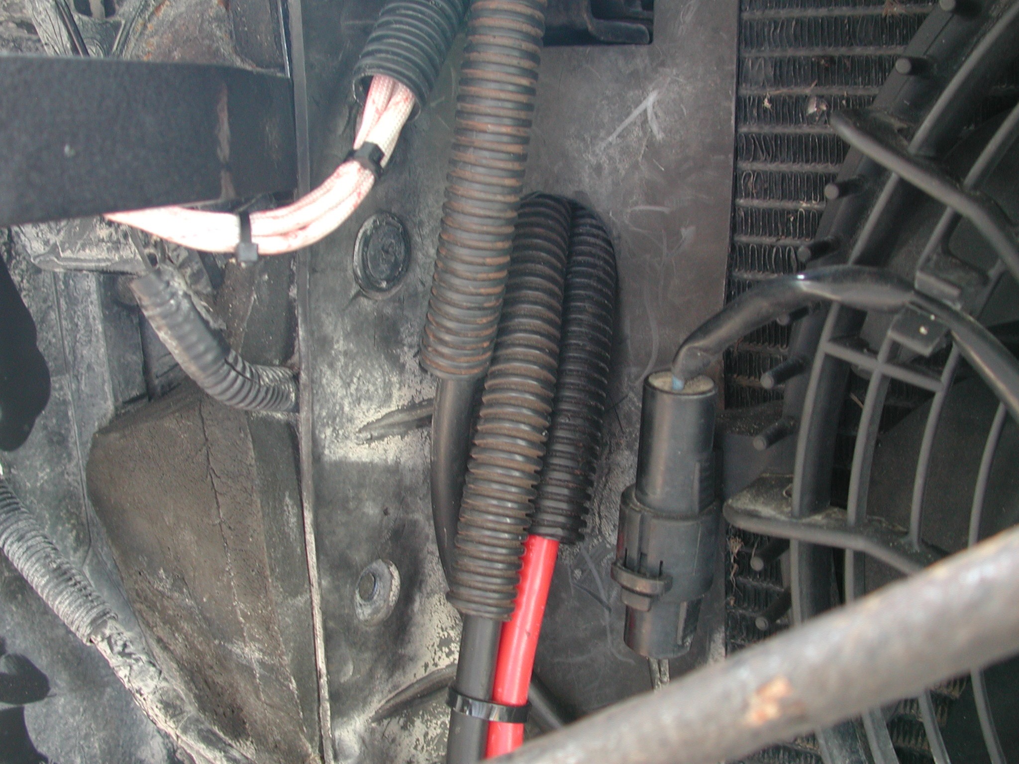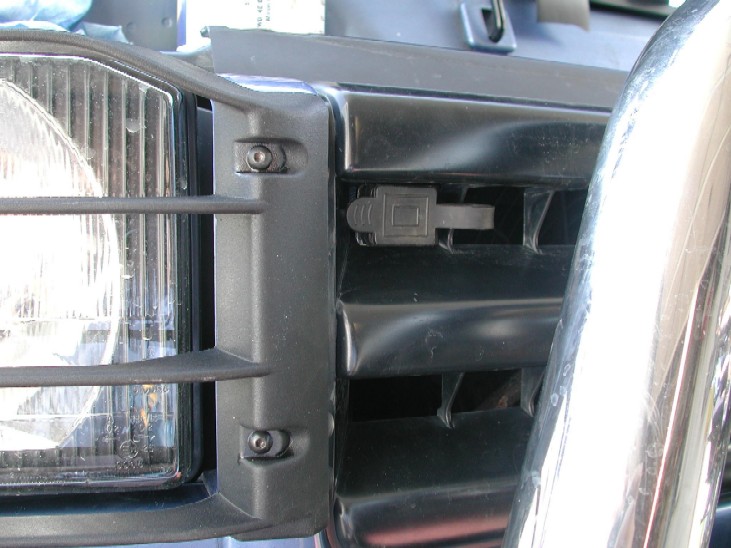 The wires were connected and lengthened to run right up to the new solenoid pack. As they pass next to the radiator and up into the engine bay they run through some plastic conduit to protect them. The "bends" in the bracket were to allow it to protrude through the edge of front grille. So when the grills all back in it looks like below