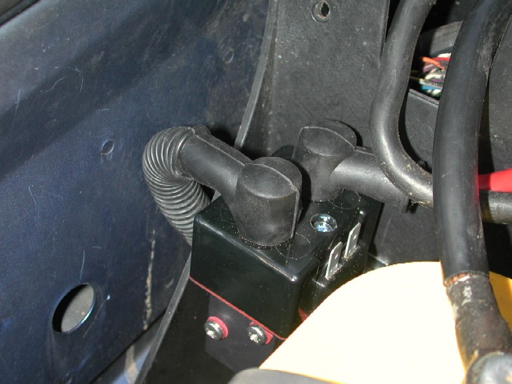 That's the "easy" bit done, now it was a case of installing a remote switch some where to operate the solenoid. There is 2 blade terminals on the solenoid which require a +12v feed and a ground, it does not make any difference which way round they are connected. The ground or earth was connected to the earth body studs where the factory battery earth is, and then another twin red / black cable was earthed also at the ground studs and run into the car for the supply wire and switch ground. They run up the side of the engine bay fuse box through the body grommet I have used before on both the roof lights and spot lights, once in the car, this was run up to the dash switch as this would become the +12v acc on and ground at the switch connections.